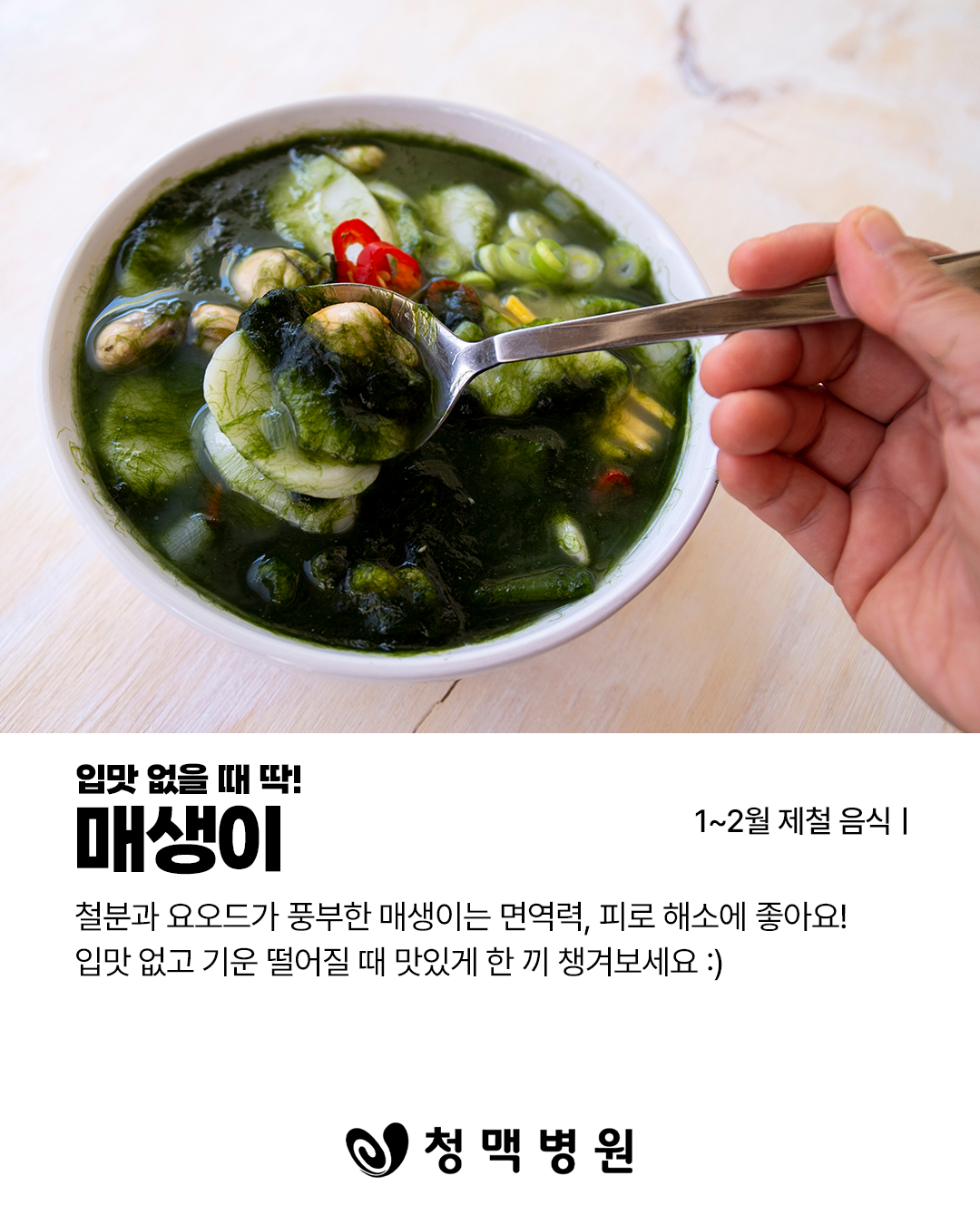 매생이는 철분과 요오드가 풍부해 피로 회복과 면역력 유지에 도움을 줘요.